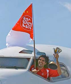Fernandão exibe o símbolo da conquista do Inter da cabine do avião