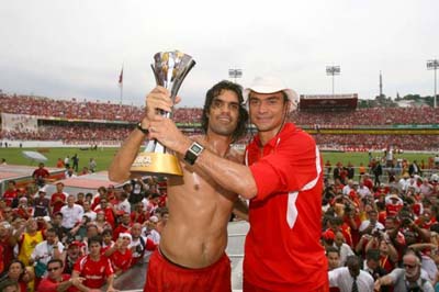 Prontamente, os colorados entoaram os gritos de guerra que acompanham a trajetória de Fernandão no Inter: "Uh, Fernandão! Uh, Fernandão!" e "Uh, terror, Fernandão é matador!". A torcida gritou o nome de todos os jogadores que estiveram no Japão. O presidente Fernando Carvalho também foi lembrado durante a comemoração, assim como as jovens revelações do Inter, Luiz Adriano e Alexandre Pato. Bem humorados, os colorados cantaram uma música para o famoso meia-atacante do Barcelona: "Ronaldinho, vai tomar...! Quem tem o Pato não precisa de você", brincaram.