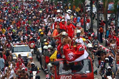 Logo nos primeiros metros de deslocamento na Avenida Augusto Severo, em Canoas, os jogadores puderam ter noção da gigantesca festa que os acompanharia durante todo o trajeto de aproximadamente 25 quilômetros. Milhares de torcedores amontoavam-se no caminho que conduzia até a BR-116 para saudar o Inter. Atrás do caminhão, uma enorme fileira de motos e carros escoltava o time campeão. No ar, helicópteros da imprensa e da Brigada Militar acompanhavam a mobilização colorada. Nem o calor de 34° atrapalhava o entusiasmo da fanática torcida.