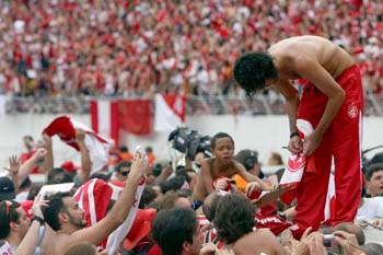 Radiantes de felicidade, os jogadores iniciaram a volta olímpica. Rentes à mureta que separa o campo da arquibancada, os campeões saudavam a torcida. Torcedores que estavam no gramado agarravam-se aos jogadores. Adriano, autor do gol sobre o Barcelona, era um dos mais assediados. "Nunca vivi nada igual. A festa é impressionante", afirmou o meia.