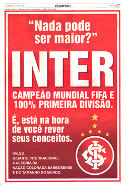 Os colorados do município de Carlos Barbosa, na Serra Gaúcha, publicaram um anúncio patrocinado pelos próprios torcedores na edição deste sábado (23/12) do Jornal Contexto. A homenagem é em virtude do título Mundial conquistado pelo Inter em cima do Barcelona, no Japão. Veja abaixo: