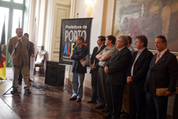Presidente colorado, Vitorio Piffero (E), fala para prefeito, secretários da prefeitura e dirigentes do clube sobre importância do convênio