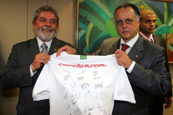 Momento histórico: Presidente Lula e o ministro do Esporte, Orlando Silva, recebem o presidente da CBF, Ricardo Teixeira, e delegação composta por dirigentes e jogadores do Sport Club Internacional (foto: Domingos Tadeu/PR)