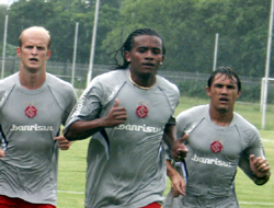 Gustavo (E), Pinga (C) e Mossoró (D): jogadores treinaram sob chuva na manhã deste sábado