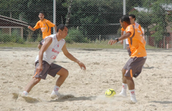Alex e Perdigão disputam lance no descontraído futebol de areia na Associação Geremia