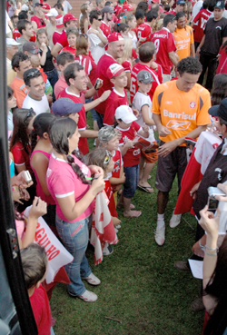 Tão difícil quanto passar pela retranca do adversário foi a chegada dos jogadores ao ônibus. Dezenas de torcedores, principalmente crianças e adolescentes, formaram filas no cordão de isolamento em busca de um autógrafo, de fotos ou de algum contato com os ídolos. O time precisou de quase uma hora pra deixar a Associação Geremia, porque os jogadores atenderam a todos com muita simpatia.