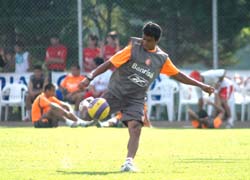 Autor do gol campeão do mundo, Adriano prepara chute durante treino
