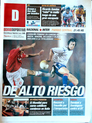 A imprensa uruguaia deu duas abordagens ao jogo de hoje. Por um lado, considerou a partida bastante difícil para o Nacional por se defrontar com o campeão do mundo. O Jornal Ultimas Noticias (foto, acima) estampou na manchete ?De alto risco? e salientou o fato de a equipe uruguaia escalar um time pouco entrosado.