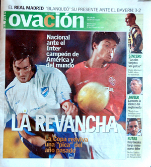 A outra abordagem foi a motivação dos jogadores uruguaios em fazer uma revanche com o Inter, como vingança da eliminação do ano passado. O El País (foto, abaixo), na edição de Esportes, mancheteou: ?A revanche? ? ?Nacional ante Inter campeão da América e do mundo.?