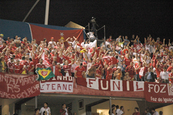 De repente, a torcida colorada avistou um torcedor com a camiseta do tradicional adversário porto-alegrense e não deixou por menos: ?Ão, ão, ão, segunda divisão? em referência às duas vezes que o time gaúcho foi rebaixado para Série B do Campeonato Brasileiro.