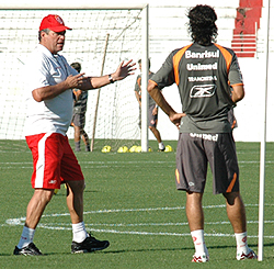 Abel Braga conversa com Fernandão durante o treinamento: Inter acerta os detalhes para a estréia no Beira-Rio