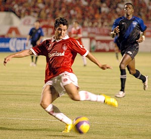 Índio (C) está subindo para marcar o segundo gol do Inter