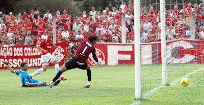 Jean está marcando o gol de empate contra o Novo Hamburgo, o primeiro do atacante com a camisa do Inter