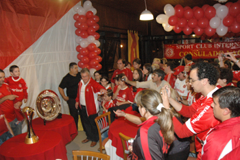 O entusiasmo de todos presentes era grande, principalmente na hora de tirar fotos com as duas mais importantes taças da América e do Mundo, respectivamente. Houve filas de colorados para registrar o momento com suas máquinas fotográficas. O salão foi todo decorado com balões, faixas, bandeiras e cartazes em vermelho e branco. Os dirigentes colorados concederam muitos autógrafos também. Depois do jantar, o presidente Vitorio Piffero fez um discurso agradecendo a presenca de todos e pedindo o apoio na partida desta quarta-feira no Estádio Alto da Glória. É fundamental a presença de vocês para ajudar o time contra o Glória, afirmou o presidente.