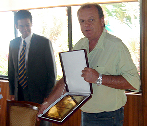 O presidente do Internacional, Vitorio Piffero, foi presenteado com uma placa pela direção do Emelec. A entrega foi feita na última terça-feira (10/04), em Guayaquil, antes do jogo no estádio George Capwell.
