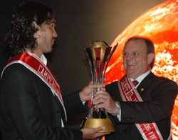 Presidente Vitorio Piffero (E) entrega taça do título Mundial ao capitão Fernandão (E)