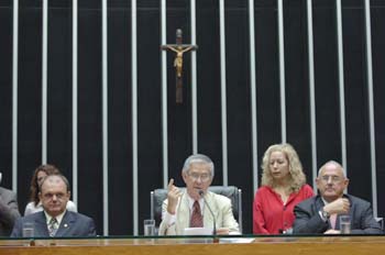 Vitorio Piffero (E), Ibsen Pinheiro (C) e Nelson Jobim (D) durante a sessão solene na Câmara dos Deputados, em Brasília