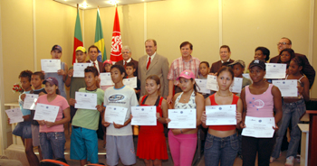 Crianças beneficiadas pelo projeto Saci Colorado exibem os certificados de conclusão do curso de informática