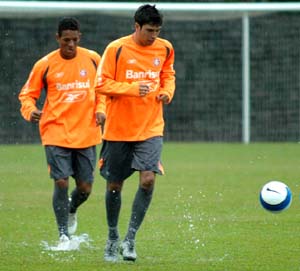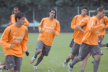 Depois de uma hora e meia de flexões e extensões, os jogadores ainda foram para o gramado da Academia Geremia realizar mais exercícios, desta vez trabalhando movimentos técnicos com a bola (cabeceio, passe), arrancadas, corridas e saltos. Apesar da chuva e do campo pesado, o grupo ficou cerca de uma hora sob os comandos de Manuel Faleiro. ?É isso aí, rapaziada. É pegada de campeão. É pra mostrar que a gente vai chegar, vai disputar o título?, gritava Faleiro para estimular os jogadores.