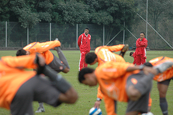 Na parte final do trabalho, foi a vez de Vargas (foto ao lado) e Wellington Monteiro entrarem no sistema como os dois volantes. Exigiu bastante dos dois meio-campistas, principalmente na saída rápida para os laterais e inversões de jogo de um lado para o outro. ?O trabalho foi muito bom pra gente para trabalhar a movimentação da defesa?, afirmou o zagueiro Titi. ?É uma maneira um pouco diferente da que eu vinha atuando, mas vamos nos adaptar o mais rápido possível?, avaliou Índio.