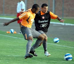 Iarley (D) luta pela bola com zagueiro Sidnei durante treino coletivo na Serra Gaúcha