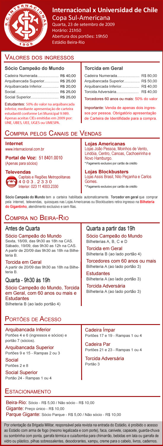 Em busca do bicampeonato da Copa Sul-Americana, o Inter estreia na edição de 2009 jogando junto com sua torcida no Gigante da Beira-Rio. Como atual campeã, a equipe colorada entra direto nas oitavas-de-final e enfretará o Universidad do Chile na próxima quarta-feira (23/09), às 21h50, no Beira-Rio. Os ingressos para os sócios colorados já estão à venda.