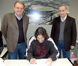 Vitorio Piffero (E) e Giovanni Luigi observam Fernandão assinar contrato