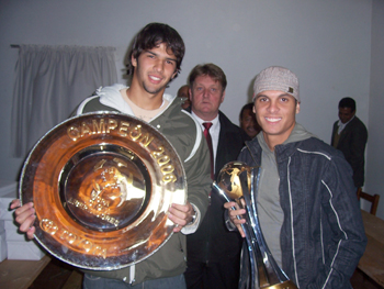 Muriel (E) e Ramon com os troféus da Libertadores e do Mundial Fifa