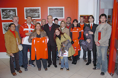 Sócios contemplados na Semana de Prêmios Campeão do Mundo Fifa posam para foto com o vice-presidente de futebol, Giovanni Luigi, no hall do vestiário profissional