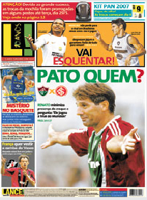 O jornal O Lance, edição carioca deste sábado, estampou em sua capa uma provocação ao atacante Alexandre Pato, do Internacional. Com a manchete ?Pato quem??, o jornal destaca que o técnico do Fluminense Renato Portaluppi teria dado declarações desdenhando o sucesso de Alexandre Pato no Mundial de Clubes Fifa conquistado pelo Inter em 2006. ?Ele jogou a final do Mundial??, questionou o treinador. Segundo o jornal, o treinador teria dito que, quando jogador, teria sido superior a Alexandre por ter marcado dois gols no Mundial do Japão, enquanto o atleta colorado teria feito um.