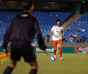 Capitão colorado, Fernandão, conduz a bola sob olhar atento do bandeira