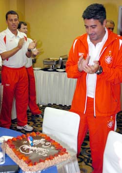 Jogadores, integrantes da comissão técnica e direção homenagearam o técnico Alexandre Gallo durante o almoço nesta terça-feira em Pachuca, onde o Inter começa a decidir a Recopa Sul-Americana a partir de quinta-feira. O treinador completou 40 anos hoje. Antes da refeição, um bolo-surpresa foi presenteado ao técnico, que ficou visivelmente emocionado com a homenagem. Depois, todo o grupo cantou parabéns e felicitou o aniversariante. ?Se eu pudesse pedir algo gostaria de ter este título da Recopa, que vai ser muito importante não só pra mim mas para todos nós?, disse o técnico, sob o aplauso de todos.