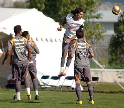 Fernandão salta para cabecear: Inter treinou no CT Rei Pelé, do Pachuca