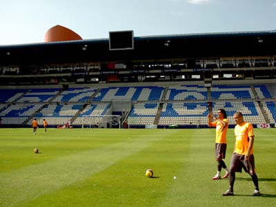 Edinho (D) e Fernandão (E) no gramado do Estádio Miguel Hidalgo