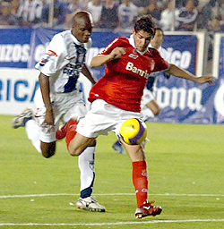 A proposta do técnico Gallo deu certo no primeiro tempo. Bem fechadinho no meio, o Inter deixava o Pachuca sem muitas opções. Com o bloqueio forte, conseguia roubar bolas e partir para o contra-ataque. E os primeiros minutos do jogo foram todos do Inter. Aos 2min, Pato foi lançado pela esquerda, que enganou a zaga duas vezes e chutou por cima. O caminho era aquele: bola para Alexandre Pato. Aos 2min40seg, o garoto promessa de craque novamente recebeu lançamento e arrematou para defesa de Calero.