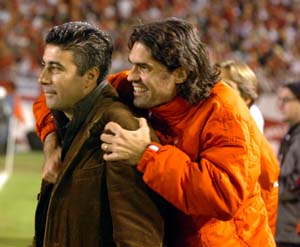 Gallo (E) é abraçado por Fernandão momentos antes do apito final