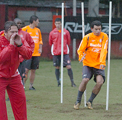 Preparador físico Manoel Faleiro (E) orienta atividade no campo suplementar
