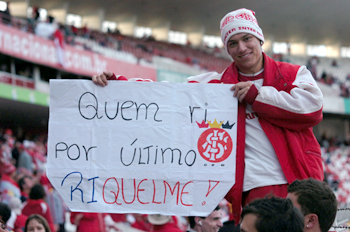A derrota do Grêmio na final da Copa Libertadores da América motivou provocações da maior torcida do Rio Grande neste domingo no Beira-Rio. Tanto no pátio do estádio Beira-Rio quanto nas arquibancadas, foi possível observar uma grande quantidade de pessoas chegando para o Gre-Nal, vestindo camisetas e bandeiras com as cores do Boca Juniors. A torcida também cantou músicas com o nome do Boca e adaptou o cântico que homenageia o capitão colorado Fernandão, para falar do principal jogador do Boca: ?Uh! Terror! O Riquelme é matador!?, gritou um grupo de colorados antes de entrar no Gigante.