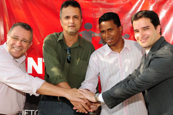 Diretor de marketing, Jorge Avancini (E), vice-presidente de esportes amadores, Roberto Melo, o filho do Escurinho, Cassios Machado, e o produtor do filme, Gustavo Ioshpe