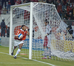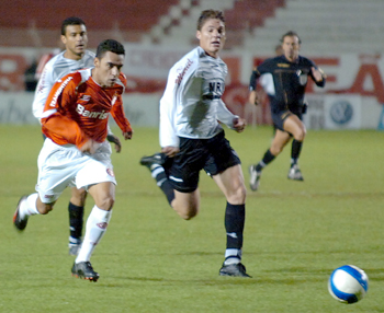 Finalmente, aos 13min15seg, o gol de empate. Luciano Henrique recebeu na área e passou na medida para Adriano (foto ao lado) completar: 1 a 1. Foi o segundo gol do atacante no Campeonato Brasileiro.