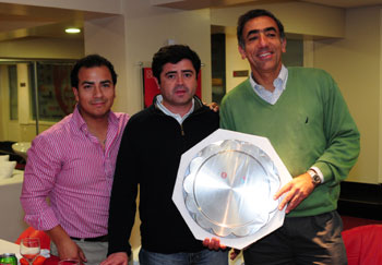 Boa recepção: dirigentes do Universidad exibem placa recebida do Inter