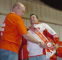 Gelson Pires (E) coloca a faixa de campeão do mundo no cônsul Alexandre dos Santos Faria