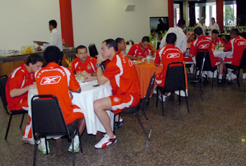 - Com os vôos para Natal lotados, a delegação teve que se dividir em dois vôos para chegar à cidade na madrugada desta sexta-feira. Os jogadores, comissão técnica, diretores e funcionários vieram em um avião que partiu às 19h45min, enquanto o médico, o fisioterapeuta, o fotógrafo e o assessor de imprensa saíram duas horas antes.