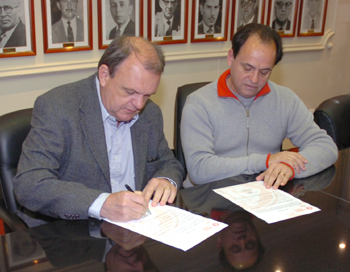 Vitorio Piffero (E) assina Termo de Parceria observado pelo Secretário Municipal de Esporte, Recreação e Lazer João Bosco Vaz