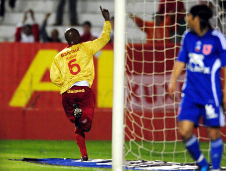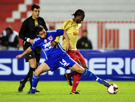O Inter começou o jogo com a posse de bola tentando pressionar os chilenos. O time colorado tentava furar o bloqueio do Universidad com o apoio dos alas e o avanço da linha dos zagueiros. Aos 5min, Fabiano Eller subiu até a entrada da área, tocou para Edu, que ajeitou para Kléber cruzar e a zaga afastar. Aos 7min, Gomez recebeu na meia-lua e girou chutando no cantinho para defesa de Lauro. Aos 11min, D´Alessandro enganou a marcação com o drible La Boba pela direita, avançou até o bico da área e cruzou para Edu, mas a bola saiu muito forte. Aos 17min, Sandro chutou da intermediária, a bola desviou na zaga e vai pra escanteio. D´Alessandro cobrou com efeito na pequena área, mas o goleiro Miguel Pinto defendeu com segurança.