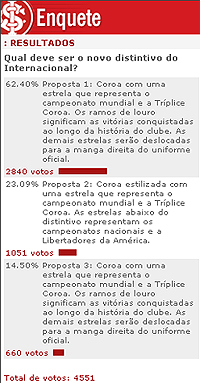 Está encerrada a votação que escolheu como serão expressas no símbolo do Inter as grandes glórias conquistadas em 2006 e 2007. O clube elaborou três propostas de escudos atualizados com a conquista da Tríplice Coroa. Os sócios puderam votar atarvés do site do dia 10 a 20 de julho. A Proposta 1 recebeu o maior número de votos: 2840 (62.40%). Os torcedores em geral também enviaram sugestões para o e-mail do departamento de marketing.