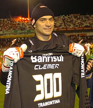 O diretor de marketing Gildo Sibemberg entregou ao goleiro mais vitorioso da história colorada (veja títulos abaixo) uma camisa preta com o número 300 e o nome de Clemer às costas. ?Não é qualquer um que disputa tantos jogos por um clube. Essa homenagem é motivo de muito orgulho para mim?, afirmou o camisa 1.