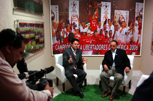 O presidente Vitorio Piffero foi o primeiro a ser entrevistado pelo jornalista Rogério Amaral durante a transmissão ao vivo pelo site do Inter. ?É um título que deu início a uma nova fase no nosso clube?, saudou Piffero, que foi o vice-presidente de futebol durante a campanha vitoriosa da Libertadores 2006. Por volta das 21h40min, horário no qual a partida começou um ano atrás, um grande foguetório começou no Beira-Rio. Era a senha para o início da cerimônia.