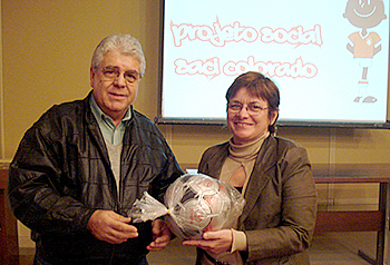 Jorge Luis Vieira da Cunha entrega bola da Toyota para a coordenadora da Secretaria Municipal da Educação de Porto Alegre Maria do Carmo Souza