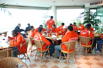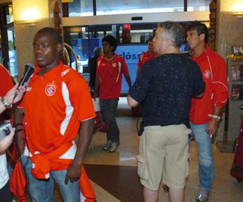 Jogadores concedem entrevista no saguão do hotel em Copacabana
